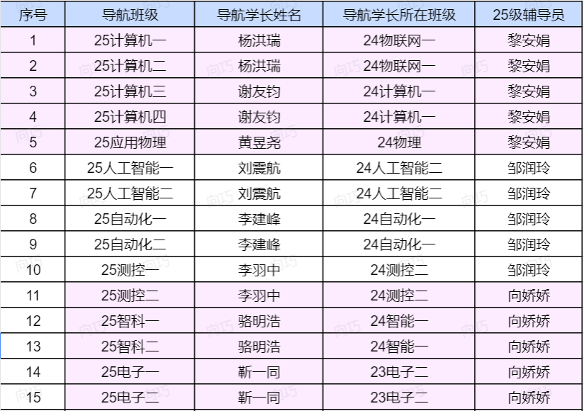 按照《关于选拔2025级本科新生导航学长的通知》要求,本着公平、公正、公开的原则,经员工自主报名、材料审核、面试考核等程序,现确定公司2025级新生导航学长人选,名单公示如下: