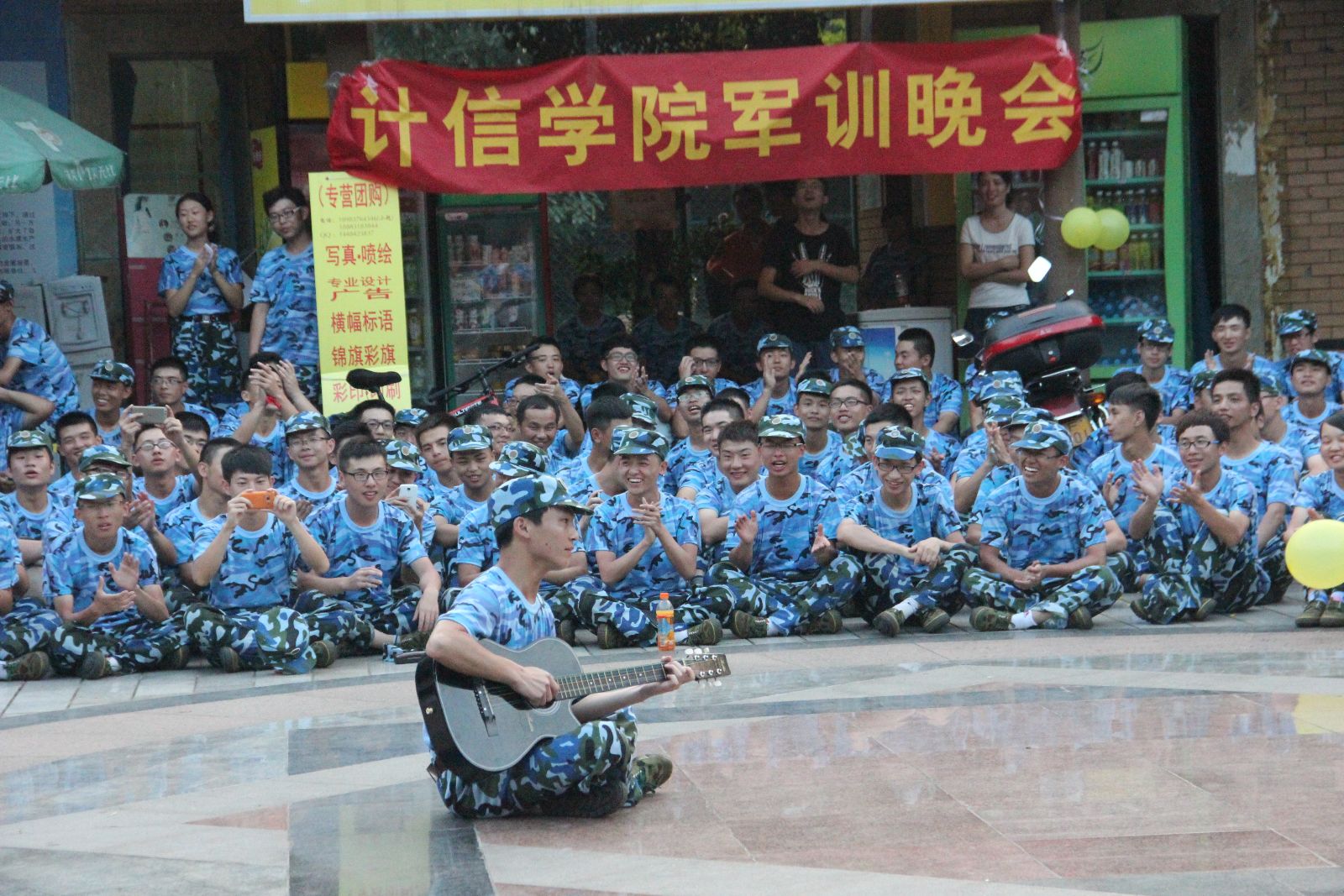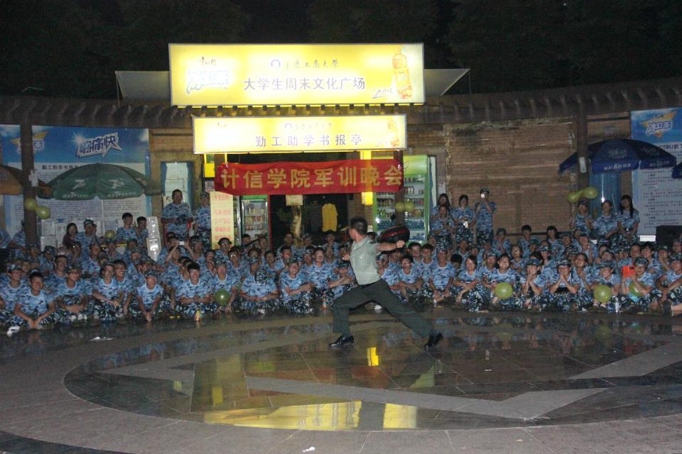 2014年7月6日晚,计信公司“军营中收获成长,军营中赢得快乐”军训晚会在周末文化广场成功举行。计信公司团委书记邵磊老师、军训二团六营营长满一教官、2013级辅导员黄亚果老师、皮进老师、曹怡老师,以及二团六营全体教官和全体参训学员参加了晚会,大家欢聚一堂,共同度过了一个美妙的夜晚!整台晚会节目形式多样,欢笑不断,精彩连连!既有相声、小品、集体舞蹈带来的欢声笑语,又有吉他合唱、古典舞蹈、军体拳带来的视听盛宴!