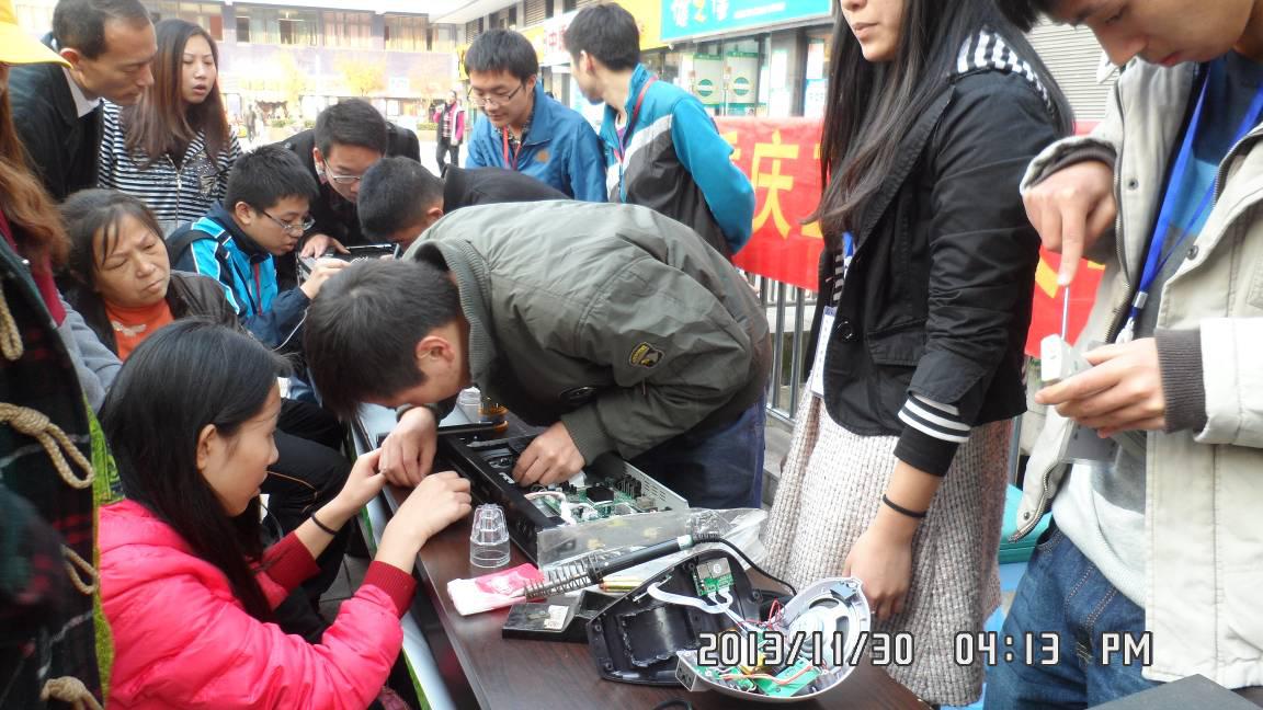 下午1:30各部门人员在香樟林集合,1:40各部门各派的部长或干事先到渝能国际向物管借桌子,2:00会长、部长和干事拿着维修工具到渝能国际。2:30宣传部开始拉“sunbet申搏家电维修协会”横幅并派人员到各个小区进行宣传义务维修活动。居民们纷纷拿着需要维修的物品下来修,如电饭锅、电磁炉、电风扇、电吹风、电脑、音箱和插线板等。会长、部长和干事们都动起手来修东西。在家协人的努力下,很多件待修物品都被我们修好了。旁边围观的居民越来越多都对我们表示赞同和感谢。有的人还问我们下次什么时候再去。5:30我们该去还桌子了,可那时拿东西来维修的人还没有断,我们把桌子还了之后又在旁边的椅子上继续为居民维修。6点,我们完美的结束我们的这次维修活动。家协人在回来的路上分享了维修经验。