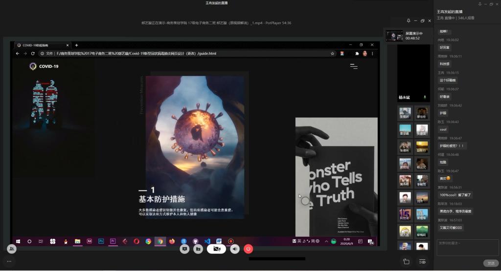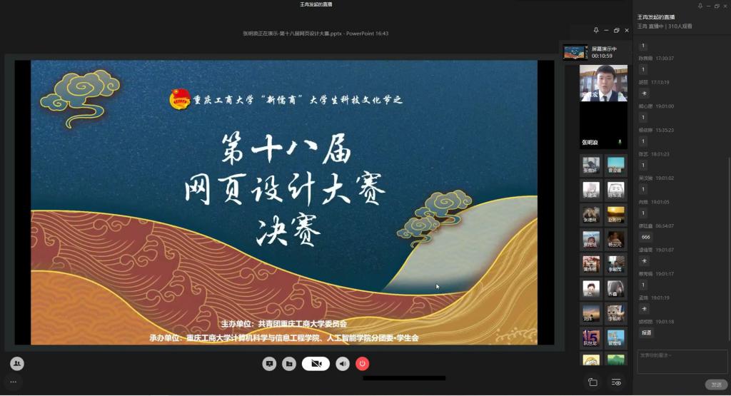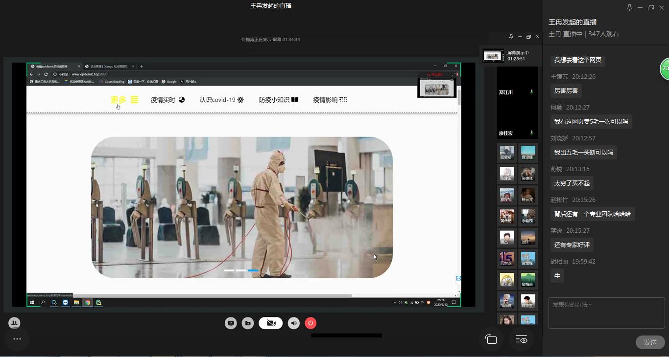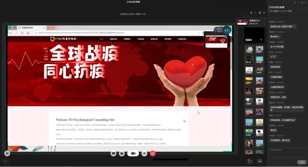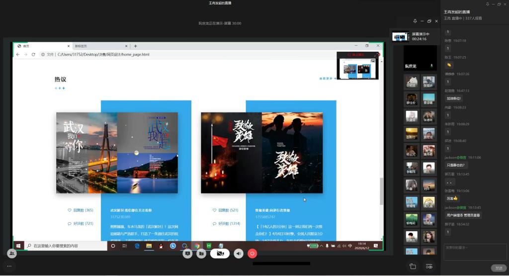 为弘扬伟大民族精神,厚植家国情怀,凝聚众志成城共抗疫情的强大力量,引导员工结合专业知识积极思考、实践,为抗疫贡献自己的智慧和力量,由校团委主办,sunbet、sunbet承办的“新儒商”老员工科技文化节之“共抗疫情,爱国力行”主题网页设计大赛决赛于6月12日晚上7点在企业微信直播间顺利举行。计信公司杨永斌副教授,杨艺副教授,唐灿副教授,赖涵博士应邀担任决赛评委。大赛邀请了校团委陆嘉副书记、计信公司分党委陈亚惠副书记、校团委徐阔老师,计信公司学工办副主任向巧老师观摩指导比赛。决赛受到了各公司员工广泛关注,吸引了超过800人次的观看。