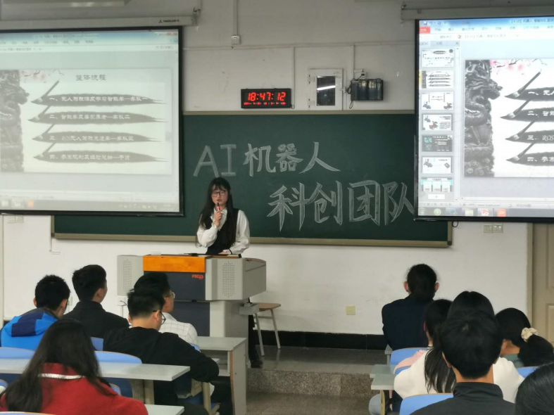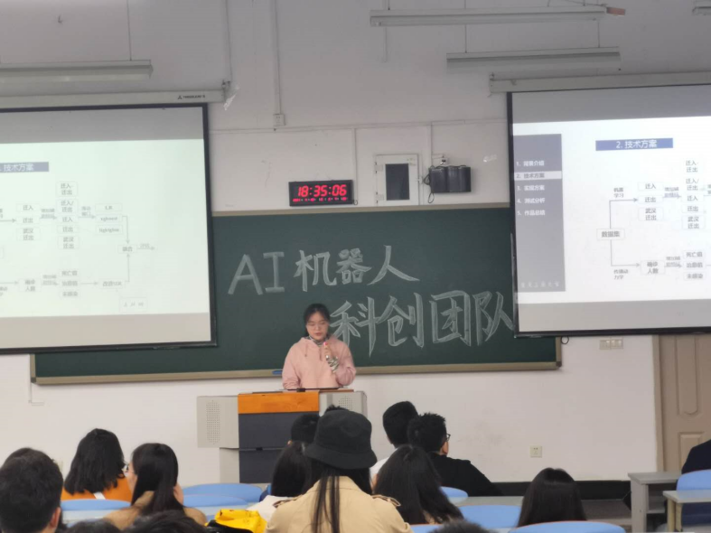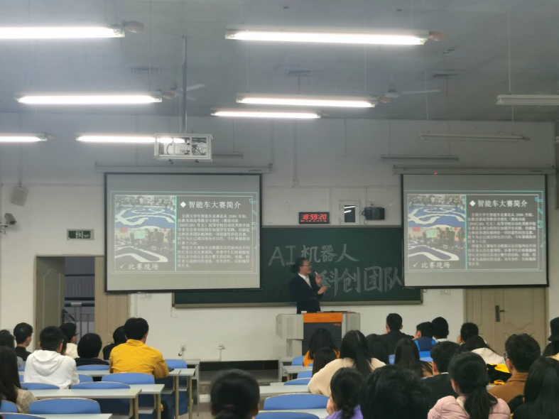 活动伊始,范兴容老师从算法设计、软硬件协调等方面阐述了AI团队和机器人团队的不同之处,希望同学们依据自己的兴趣选择心仪的团队。范老师指出,近年来人工智能相关竞赛方兴未艾,其核心技术需要人工智能专业学子的踊跃参与。接下来,AI小组代表何文婷分享了AI竞赛经验和心得体会,展示了竞赛作品的背景介绍和技术实现等方案。智能车小组代表孟滇、欧阳剑、李洪廷从实现流程和成果展示等方面详细介绍了智能车项目。AR团队成员们希望同学们将专业特色和科技竞赛文化传承下去,同时鼓励大家尽早对老员工活做好规划,敢于实践,积极创新,不负韶华。