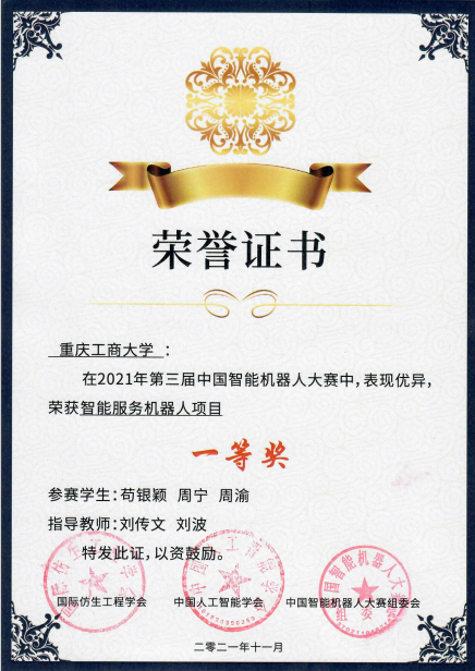 来自公司AI机器人科创团队的参赛作品《智能服务机器人项目》(作者:苟银颖、周宁、周渝,指导老师:刘传文、刘波)获得全国一等奖。