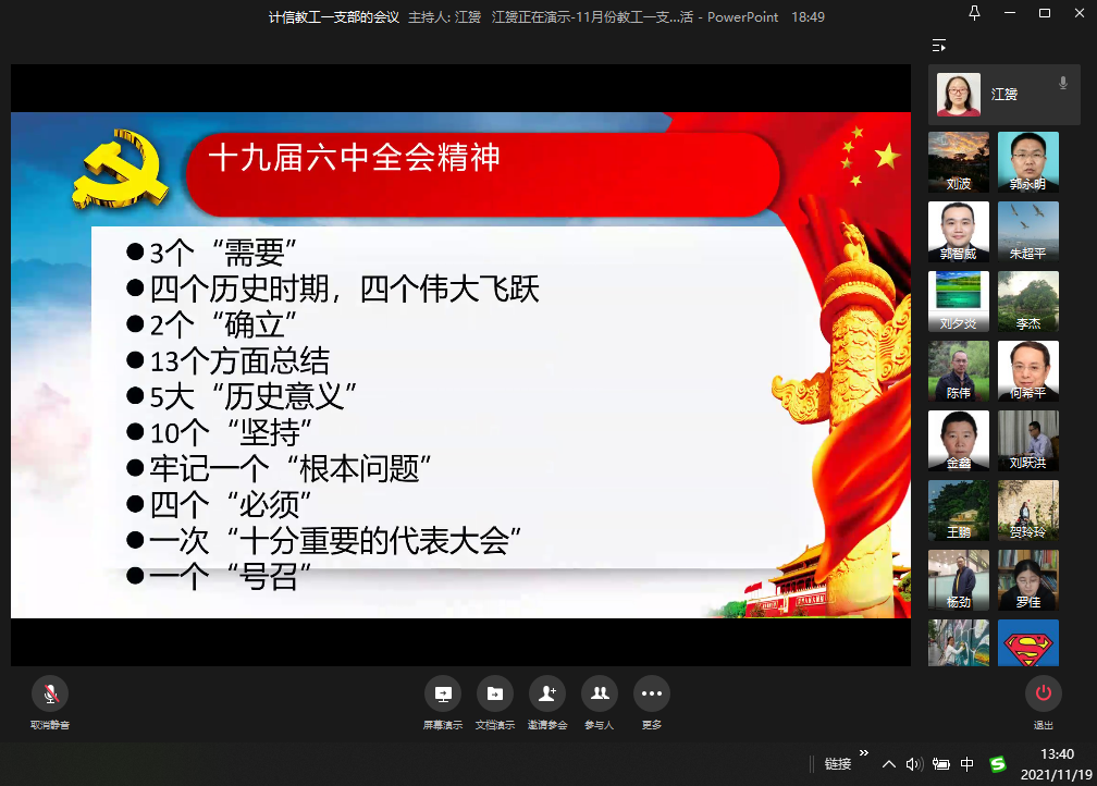 为深入学习贯彻党的十九届六中全会精神,2021年11月以来,sunbet教工第一党支部采取主题党日、三会一课等形式开展专题学习和支部组织生活,以线上线下相结合的方式学习十九届六中全会精神。