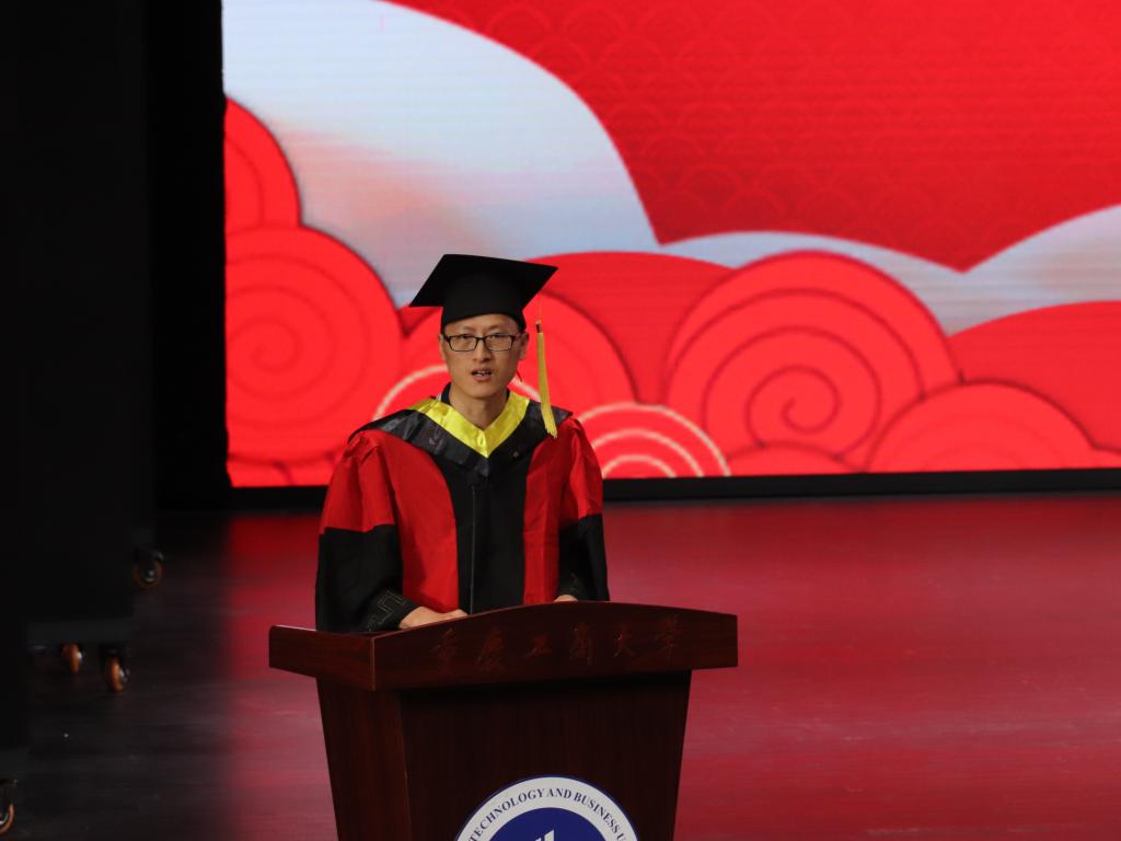 95级测控专业、公司员工分会执行会长印强发言。他与同学们分享了求学的经历和对人生、工作的思考。他说,长期以来“厚德博学,求是创新”的校训不仅是他求学阶段的一把标尺,更是人生道路上的一盏明灯。他希望同学们始终秉承校训,奋力拼搏、扬帆逐梦,投身祖国的建设,展现CTBU人的格局和风范。