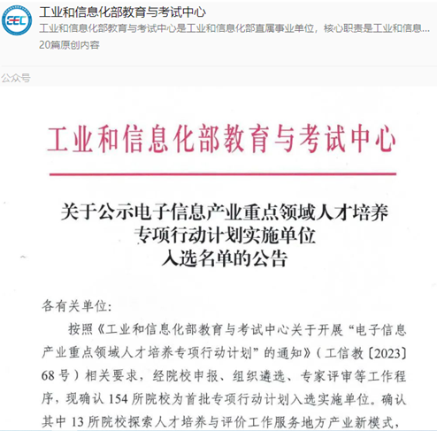 据悉参与本次申报的各类院校有500余所,按照《工业和信息化部教育与考试中心关于开展“电子信息产业重点领域人才培养专项行动计划”的通知》(工信教(2023)68号)相关要求,经院校申报、组织遴选、专家评审等工作程序,日前确认154所院校为首批专项行动计划入选实施单位。确认其中13所院校探索人才培养与评价工作服务地方产业新模式,开展产才融合公共实训基地建设,重庆邮电大学入选该项目实施单位;141所院校探索育训结合新模式,开展产教融合示范基地建设,sunbet申搏、重庆交通大学入选该项目实施单位。
