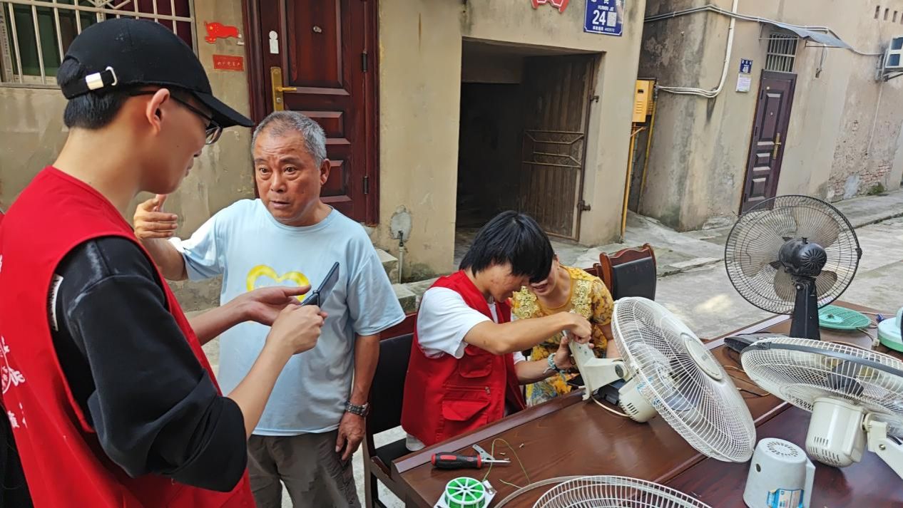 7月17日,团队走进华兴镇惠民社区开展集中义务维修。在当地工作人员的大力支持和广泛宣传下,前来送修的居民络绎不绝。有了前期走访入户经验,团队更了解当地居民怀旧小家电集中的品类和维修痛点,集中义修的配件准备更加充分、故障摸排更加精准高效,大大提高了维修的成功率。此外,实践团还耐心细致的为村民们普及了家电养护小知识,为他们进行简单的维修技术培训,尽力帮助乡亲们打通家电维修最后一公里。