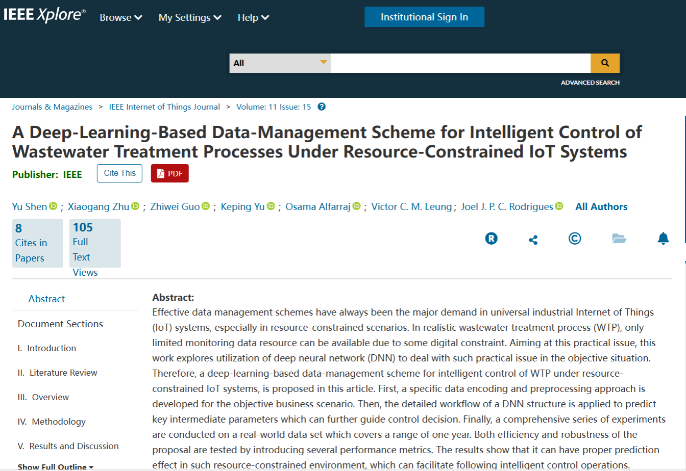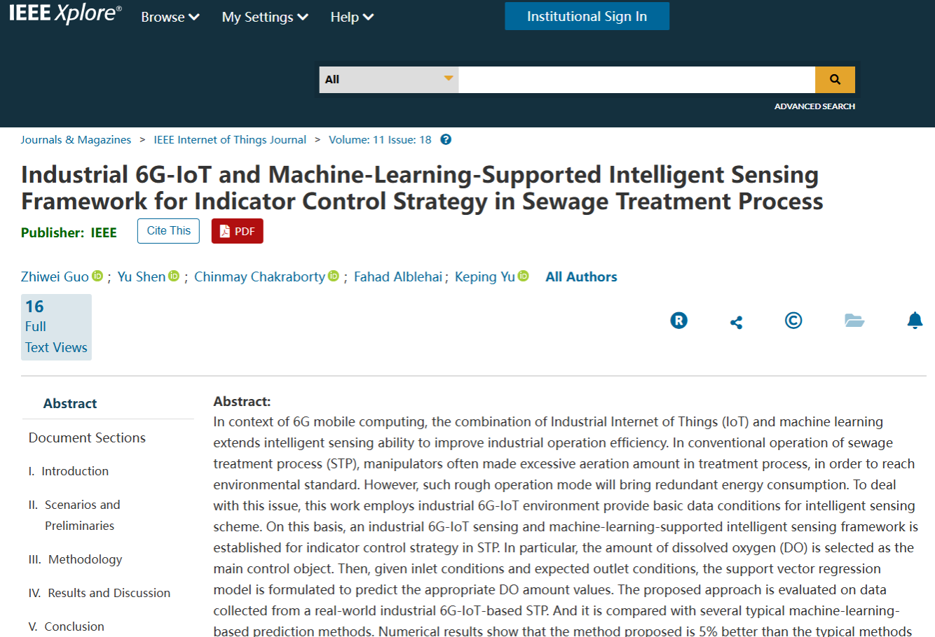 2)针对传统大型污水厂等设施粗放低效运行的现状,团队提出利用工业 6G 物联网环境为智能传感方案提供基础数据条件,建立了工业 6G 物联网传感和机器学习支持的智能传感框架,所提方法在实际污水处理厂收集的数据上进行了评估,结果表明,所提出技术方案能够较好地调控工艺过程关键指标,实现污水厂的数字化运维。