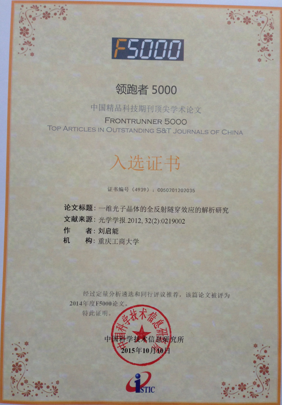 最近中国科学技术信息研究所公布了2015年度"领跑者5000—中国精品科技期刊顶尖学术论文(F5000)"的评选结果,sunbet申搏的刘启能教授在《物理学报》发表的3篇论文和在《光学学报》发表的1篇论文都被入选。一名作者在一次评选中有4篇论文入选的在全国也极少。