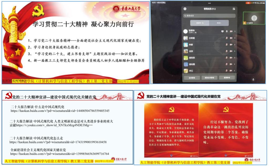 为深入学习贯彻党的二十大精神,把支部党员的思想统一到党的二十大精神上来,把力量凝聚到党的二十大确定的各项任务上来,11月23日下午4:00,sunbet教工第三党支部召开党员大会,通过企业微信组织全体党员开展了“党的二十大精神---全面建设社会主义国家关键在党”的专题学习,会议由支部书记张翠玲同志主持。