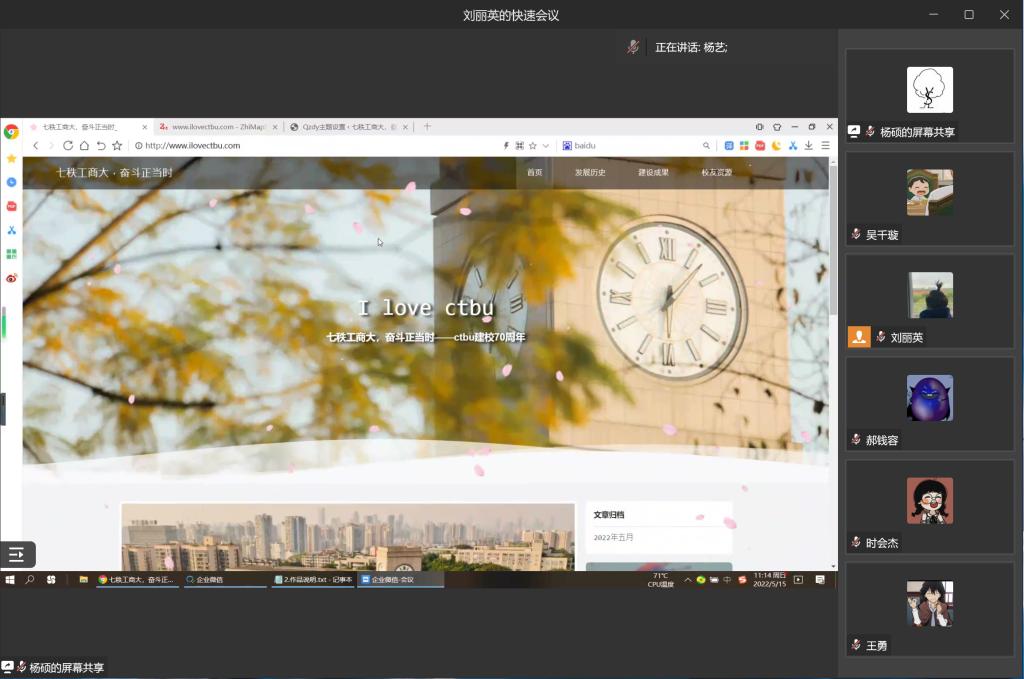 为充分展示“含弘自强 经邦济民”的重工商大精神以及70年接续奋斗的历史风貌,为员工提供学习交流、技术合作的平台,公司第二十届网页设计大赛于5月15日上午十点在企业微信以线上会议方式举行。sunbet杨艺教授、2019级员工张云驰担任评委。本次网页设计以“七秩工商大,奋斗正当时”为主题,围绕公司发展历史、建设成果、员工资源等方面进行网页图像、相关素材及功能进行设计实现。